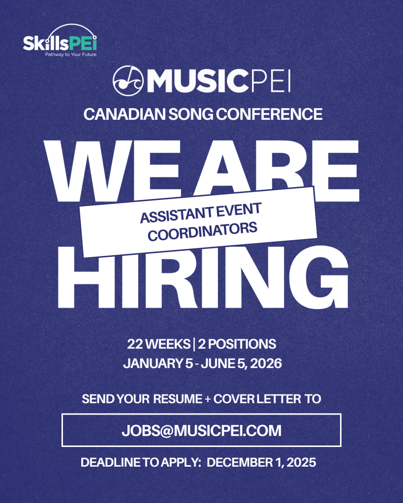 A special thank you goes out to all the funders who make Music PEI Week possible, including the City of Summerside, the Province of Prince Edward Island, Innovation PEI, the Atlantic Canada Opportunities Agency (ACOA), Skills PEI, SOCAN, and the City of Charlottetown.